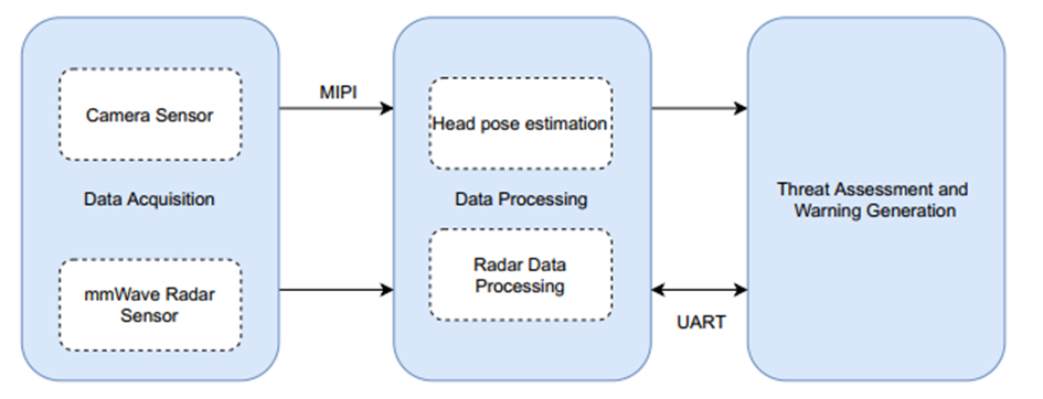 automobiles to bicycles has limitations due to complexity, cost, and size. In this master thesis, a multi-sensor integrated forward collision warning(FCW) system with visual distraction detection is developed. The system uses Millimeter Wave (mmWave) radar module for detecting the vehicle in the front and a camera module to estimate the head pose of the rider. The Time-To-Collision (TTC) and Minimum Safe Distance (MSD) metrics are then used to assess the threat and alert the rider. The Threshold of the TTC is varied based on the alertness of the rider. This method shows good performance with an accuracy of 96.7% in shared road scenarios.