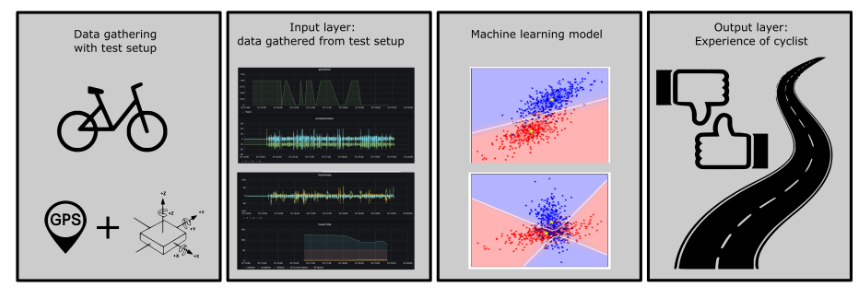 The goal of this research is to create a software that uses machine learning to accurately label road quality when cycling to get an overview of the roads that are in need of improvement or are being experienced as a good road. A data collection setup was made, using IMU and GPS sensors connected to a Raspberry Pi with a connection to bucket. The user labels roads as good or bad using two buttons on the bike handlebars. Two machine learning algorithms are applied to the data: LDA and QDA. A validation was performed on a road of which the model did not get a label as input. LDA ad QDA lead to an accuracy of 0.83 and 0.82 respectively. A specificity of 0.66 and 0.72 was reached respectively and both had a sensitivity of 0.92. During the validation, all three types of roads that were measured got a classification that matched their label, validating the model. Further research could improve the model, for instance use of more sensors, more data to feed to the model, application of other machine learning models and other methods of labeling data. The LDA and QDA machine learning algorithms both have the potential to automatically label road quality in cycling.